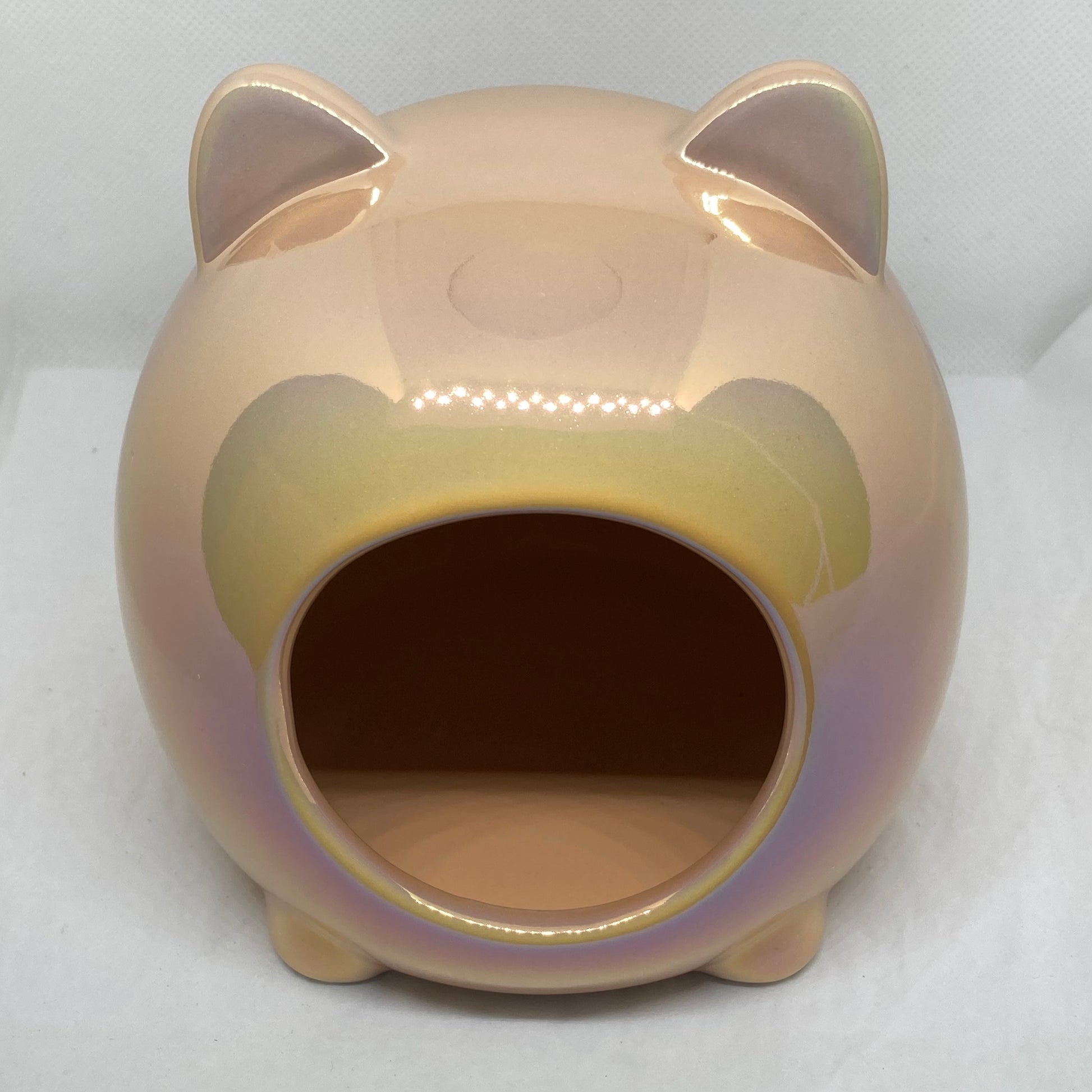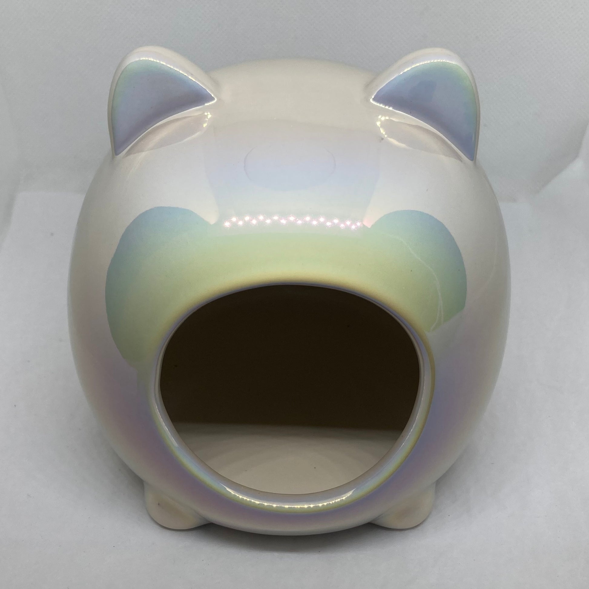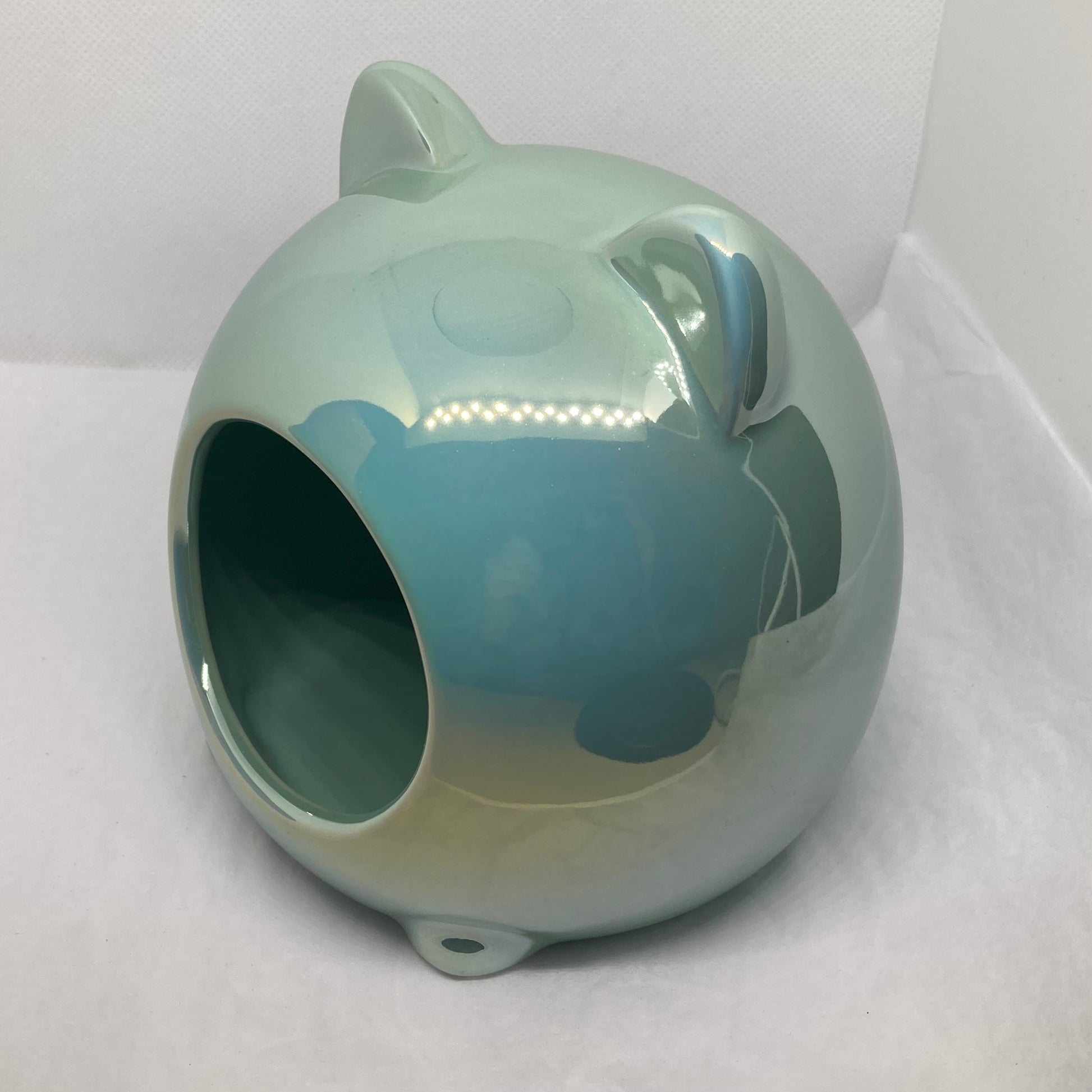 Petite cachette en forme de chat métallique pour hamster ou petit rongeur.