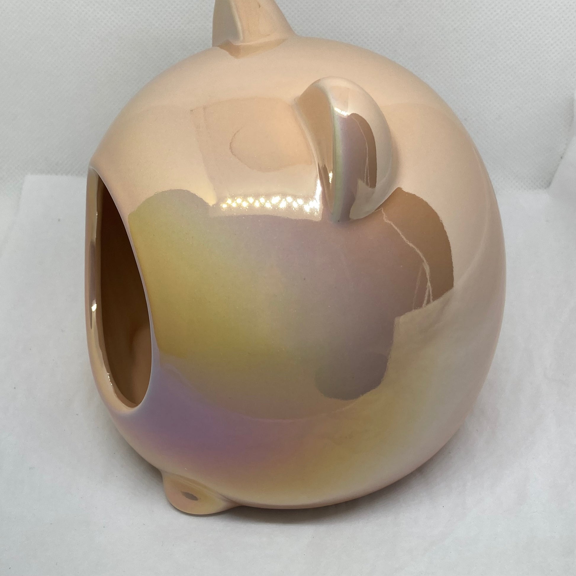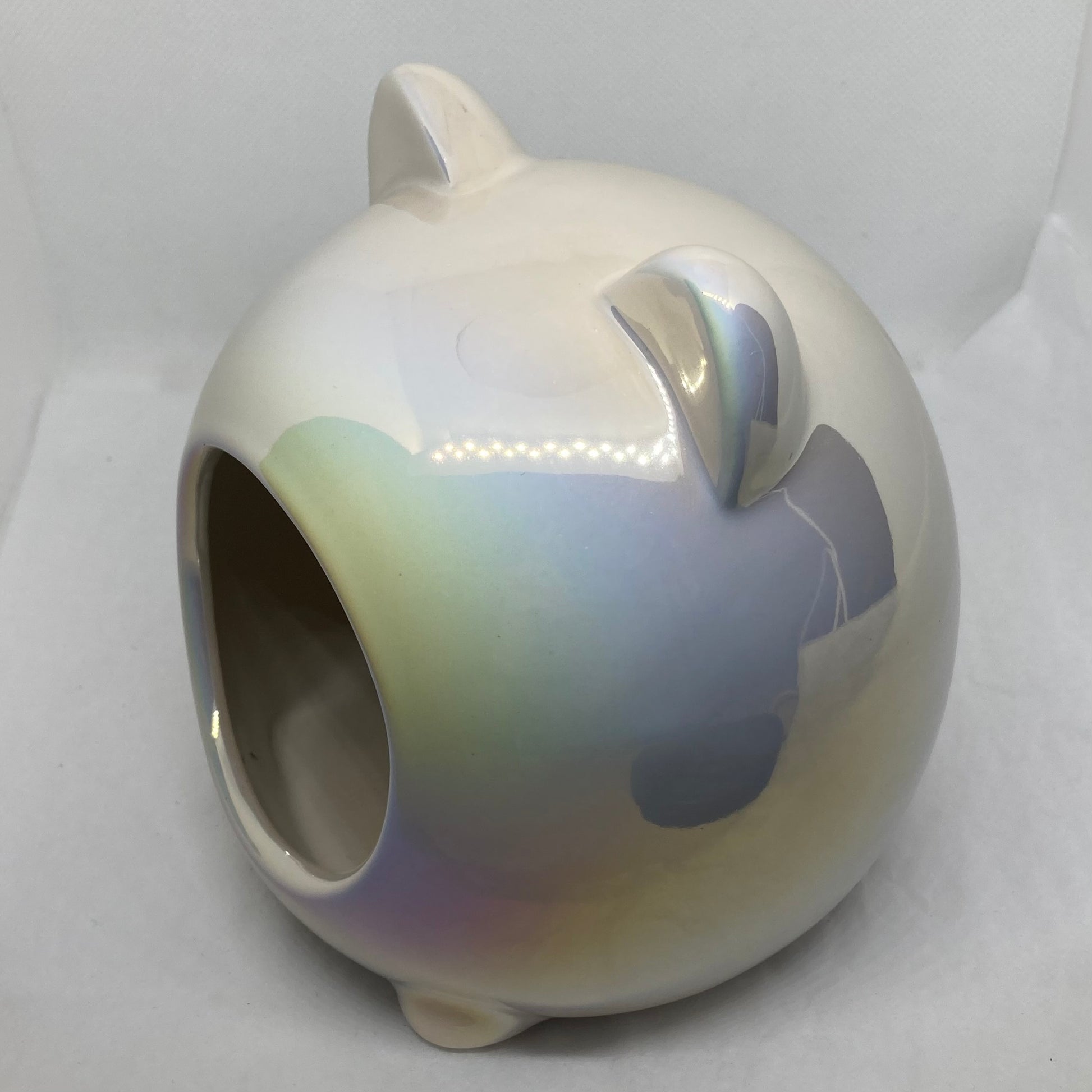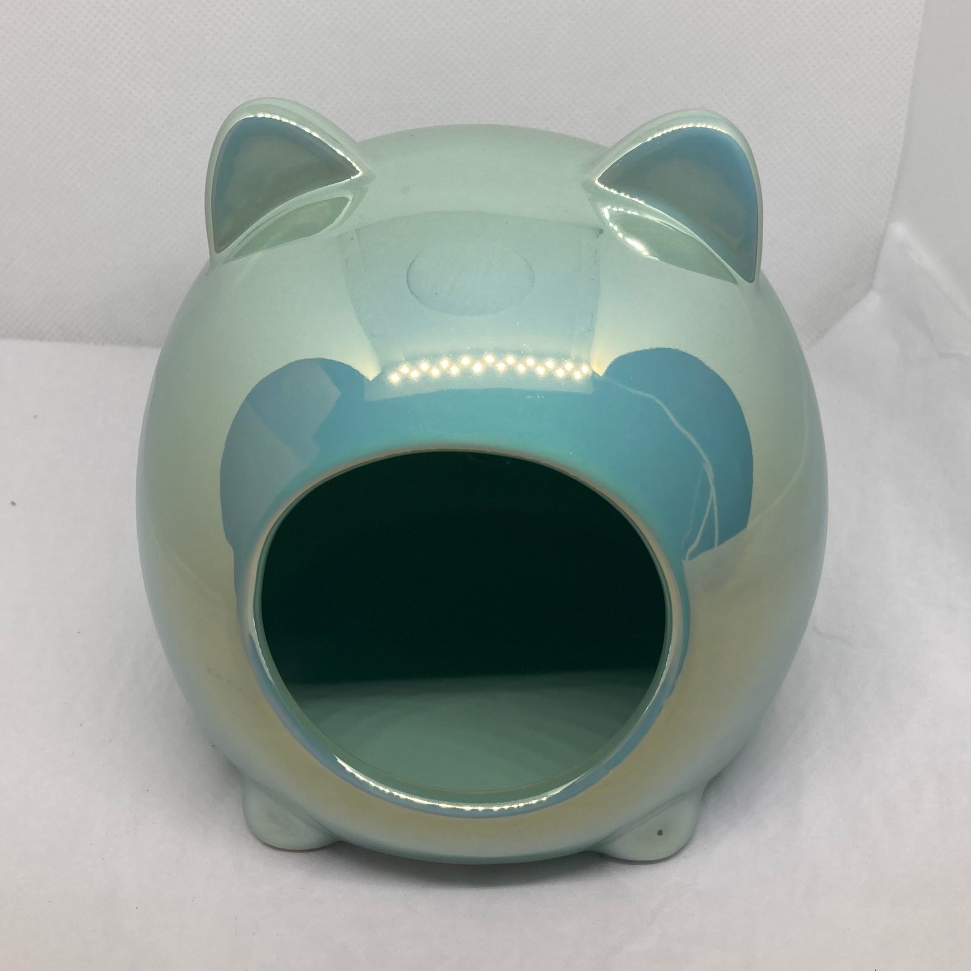 Petite cachette en forme de chat métallique pour hamster ou petit rongeur.