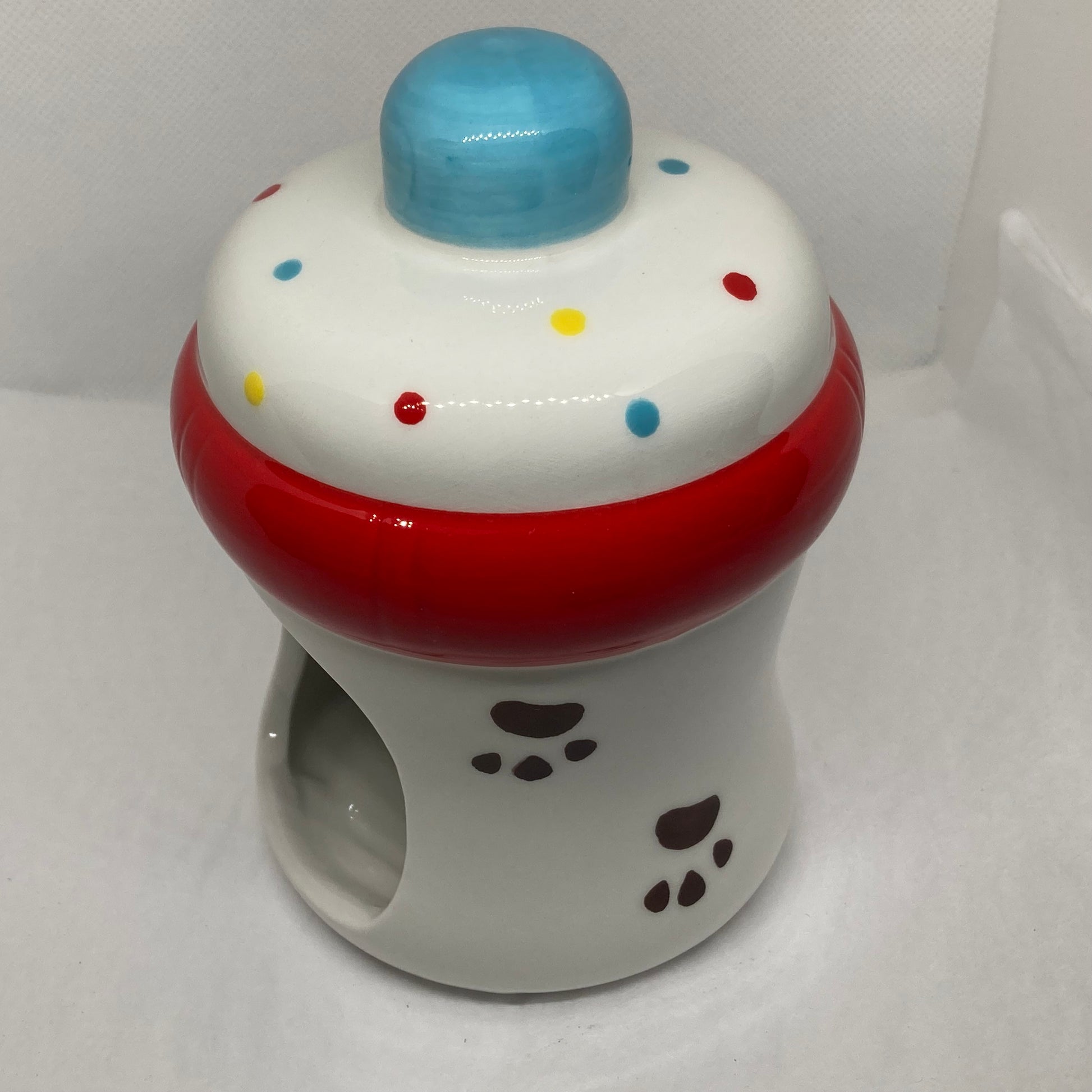 Petite cachette pour rongeur en forme de bouteille. Elle est blanche, rouge et bleu avec de petites pattes dessus. Faite de céramique, cette cachette est parfaite pour les longues journées d'été ou la chaleur peut devenir trop intense pour nos hamsters et autres compagnons.