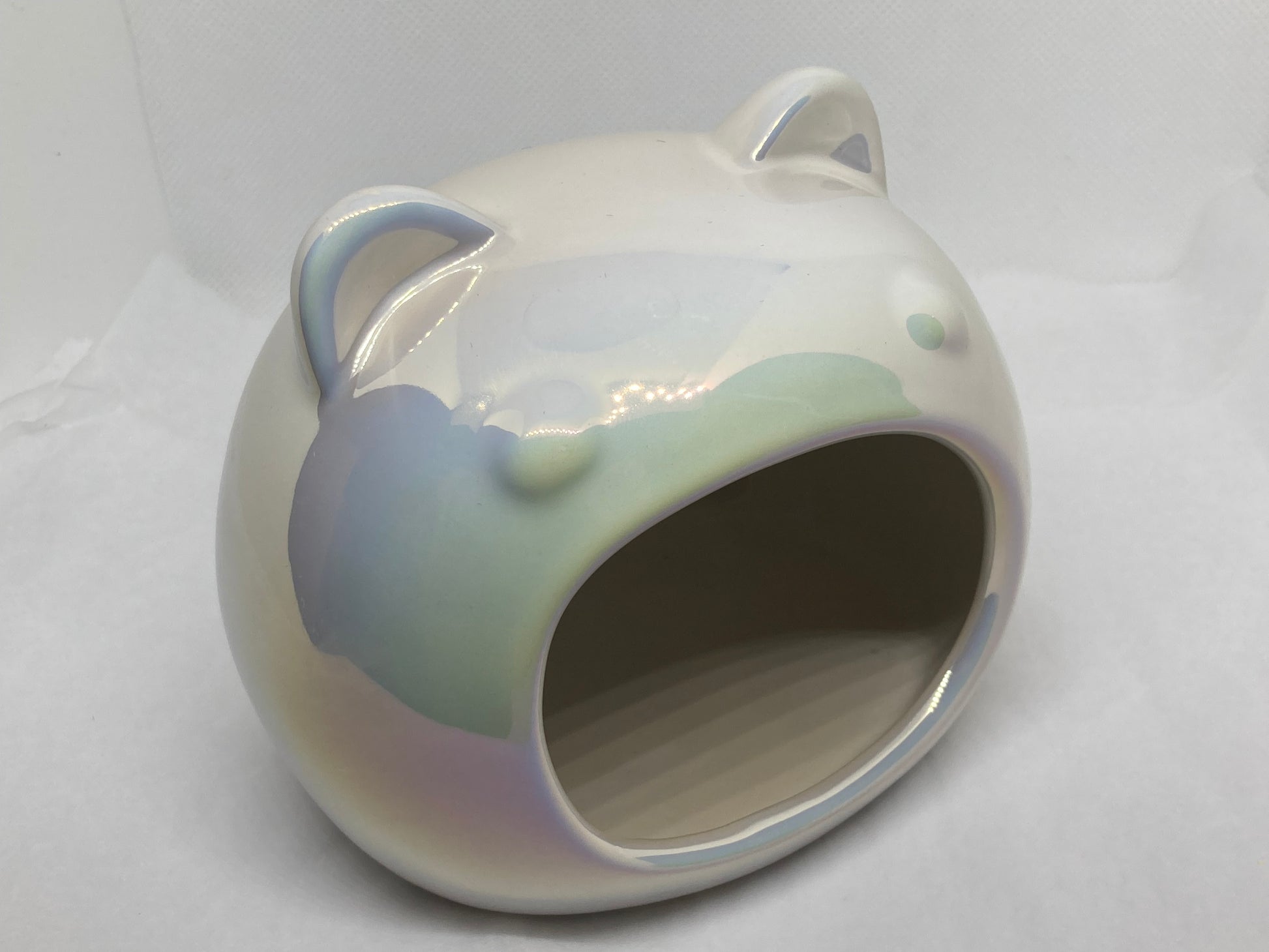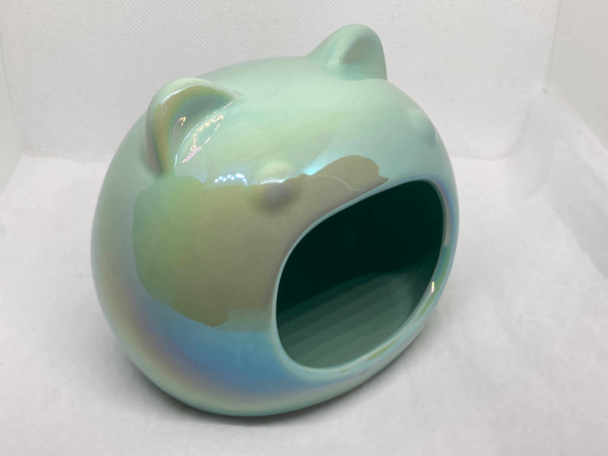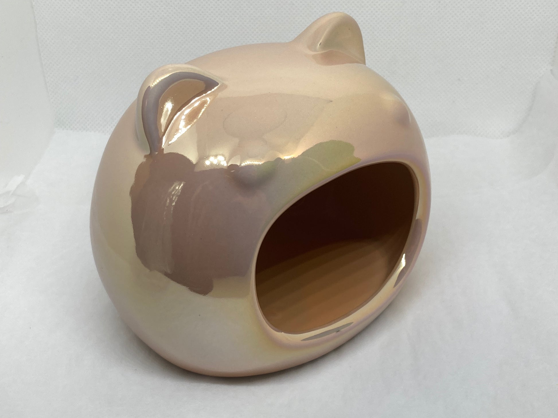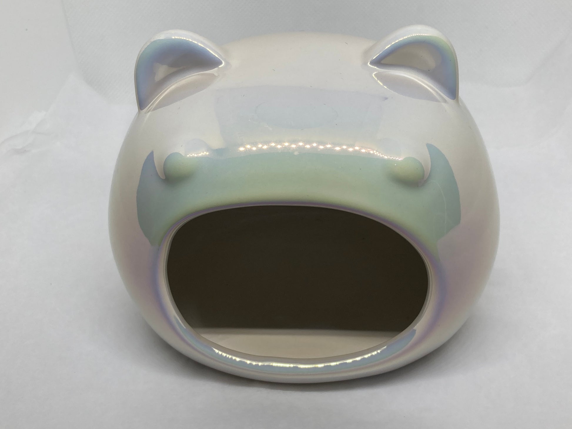 Petite cachette en forme d'ourson métallique pour hamster ou petit rongeur.