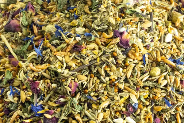 Ingrédients: sarrasin, millet, graines d'alpiste, amarante, graines de graminées, sésame, périlla brune, chardon-marie, graines de lin, cardi, graines de chicorée, graines de framboise, graines d'ortie, graines d'églantier, crevettes d'eau douce, fleurs de souci, fleurs d'hibiscus, bleuet rouge, bleuet bleu, menthe poivrée, mélisse, camomille